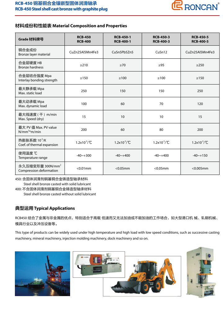 RCB450結合了金屬與非金屬的優點,特別適合于高載低速而又無法加油或不能加油的工作場合,如大型港口機械、軋鋼機械、模具行業以及沖壓設備等。